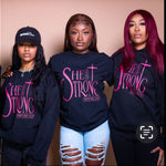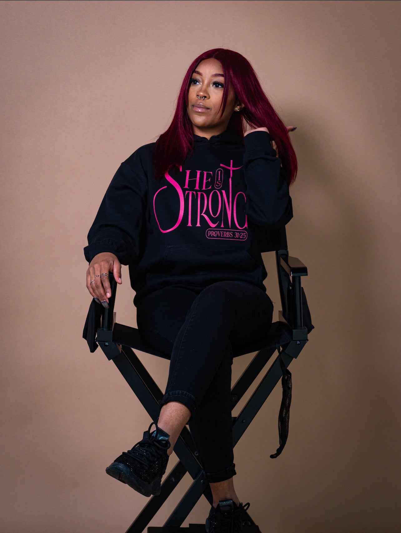 Stand tall in strength and solidarity with our She is Strong crewneck, designed to honor Proverbs 31:25 and support Breast Cancer Awareness. Crafted in bold black with empowering pink accents, this hoodie symbolizes resilience and courage. The verse "She is clothed with strength and dignity" is a powerful reminder of inner beauty and unshakable faith. Made with soft, high-quality fabric, it provides comfort for every journey.